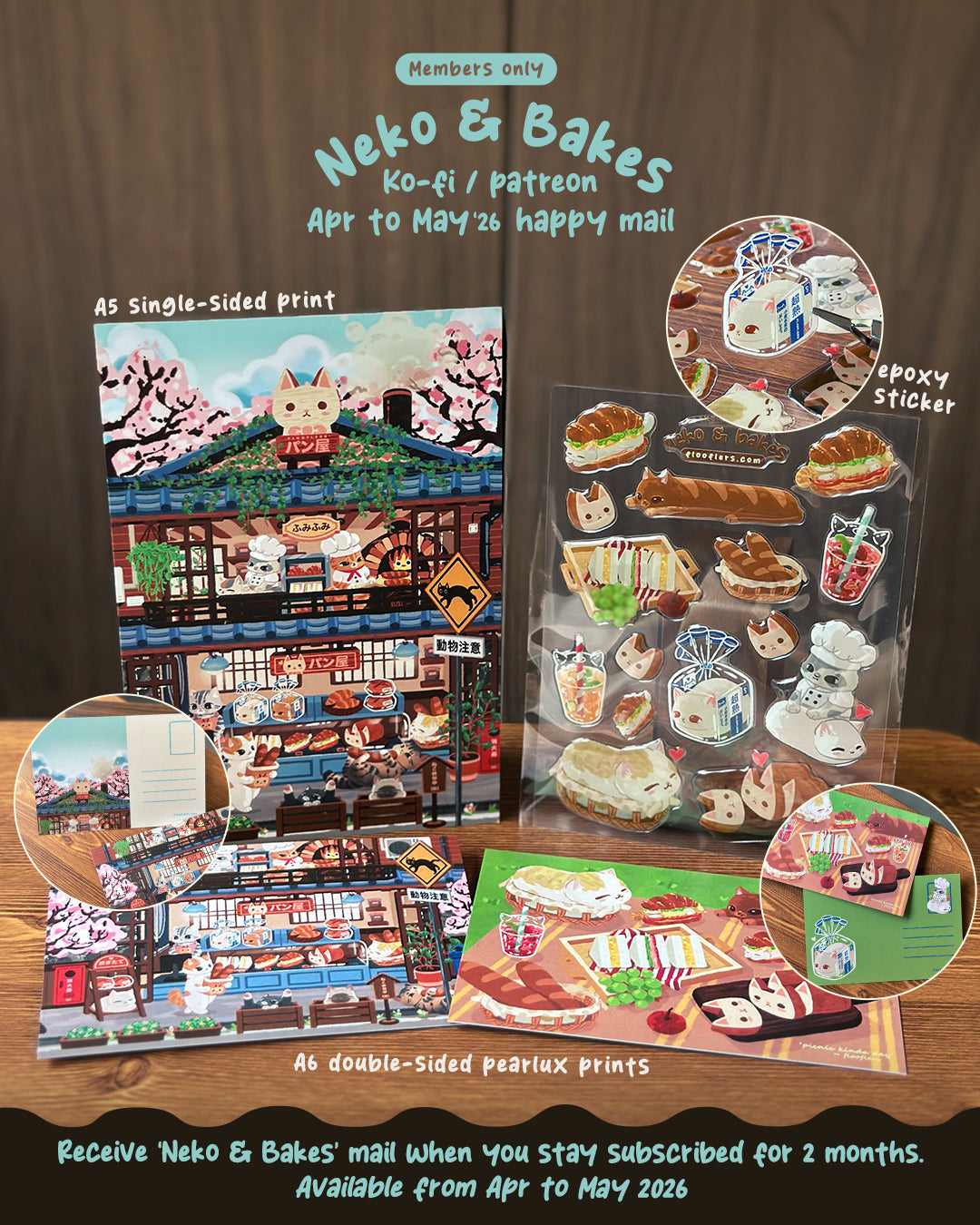 Apr to May '26 happy mail features Neko & Bakes, a part of town that served up baked goodies, where tiny paws gather for warm treats fresh from the oven.