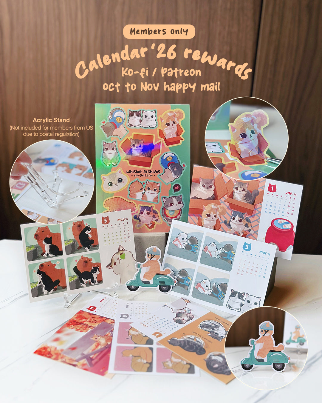 Oct to Nov happy mail features calendar prints for 2026! Bonus includes a diecut sticker and acrylic stand*. Join and stay subscribed for two months to receive mail!