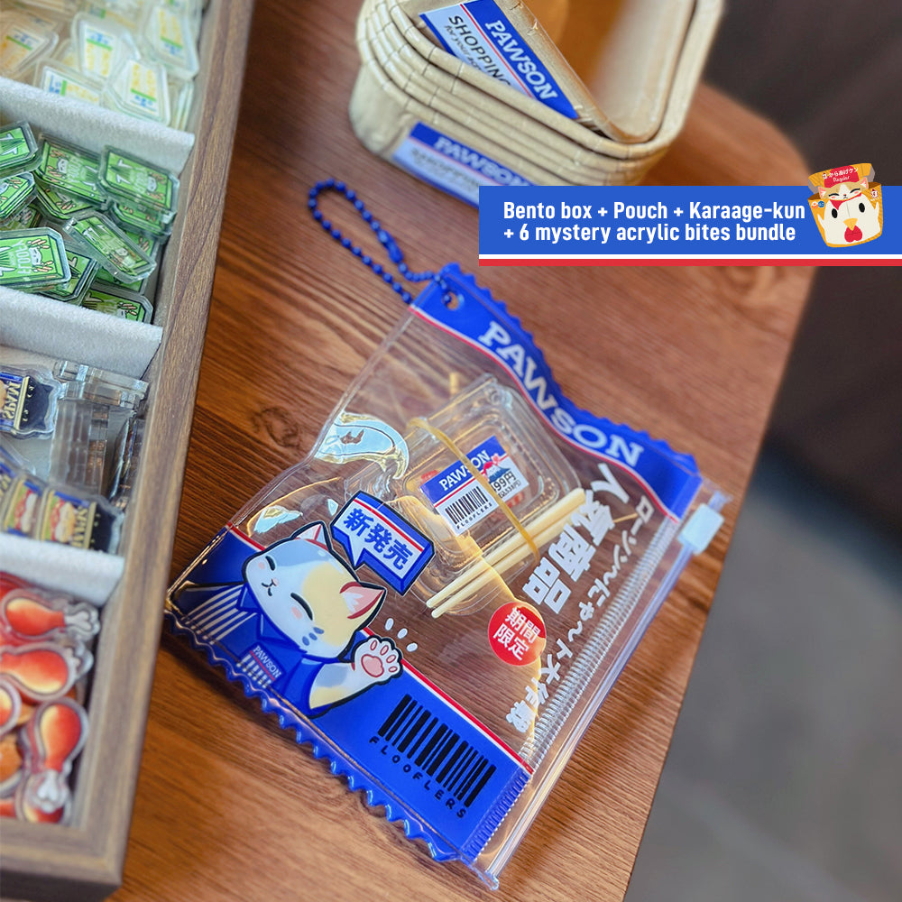 Bundle includes 1 bento box & chopsticks, 1 matching clear pouch, 1 regular Karaage-kun acrylic, and 6 mystery acrylic bites.