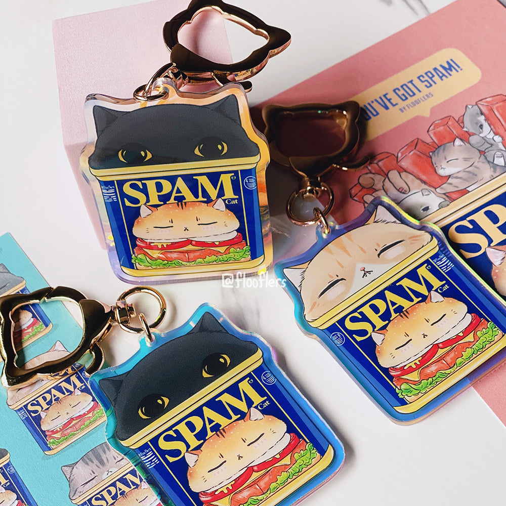 Black and ginger floofs spamming on each side of this double-sided rainbow acrylic piece, reflecting light in a splash of colours.